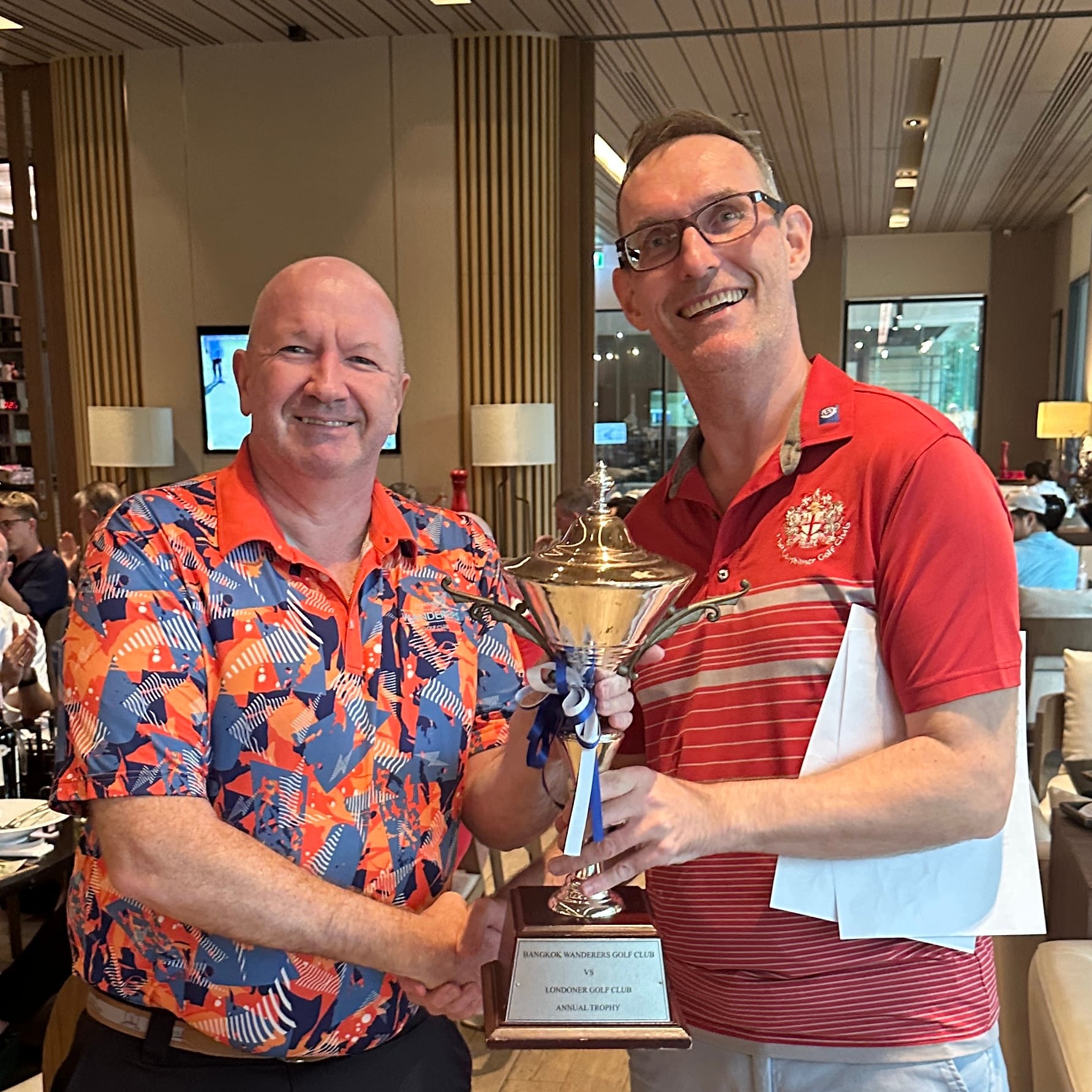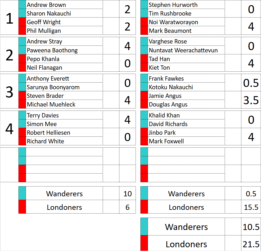 Once the scoring had been completed we found that the Wanderers had scored more points on the matches that started on hole 1 but that Londoners had won all but half a point from the matches that started on hole 10. As such the Londoners have retained the trophy with an overall win by 21.5 points to 10.5 points. Congratulations to our Londoners team and commiserations to Andrew Brown and the Wanderers team. This takes the overall score in the series to 6-4 in Wanderers' favour. Roll on next year!