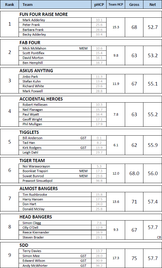 Prevailing at the end of it were the overjoyed 'Fun Four Raise More' team of Becky Adderley, Mark Adderley, Barbara Frank and Peter Frank. Net 52.7 - way to go!